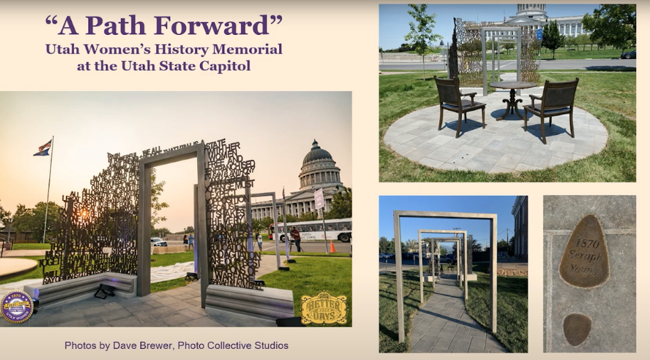 While you’re there, don’t miss the new Women’s History Memorial unveiled last August in commemoration of the centennial of the 19th amendment. It’s right across the street from the state capitol, in front of Council Hall, where Seraph Young cast that first historic vote. Designed to be an interactive experience, it incorporates many details from Utah’s suffrage story, including Seraph’s footprint, quotes from Utah suffragists, and four expanding door frames engraved with key pieces of federal legislation that extended voting rights. The path continues beyond these frames, signifying that we are each part of the continuing journey toward equality and justice that began here in Utah so many years ago.