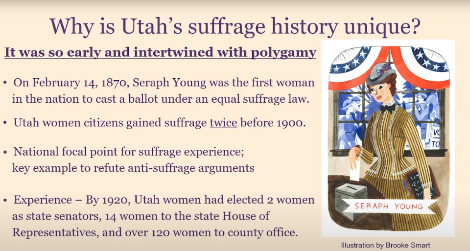 That’s an excellent question because Utah suffrage was completely, inextricably linked with polygamy right from the start. It was actually first suggested to give women in Utah the right to vote by the New York Times. This was a theory that started in Congress, and their thought was if you give women in Utah the right to vote, they’re going to overthrow polygamy. And it was also kind of an easy way to test out women’s suffrage in a place they didn’t really care about. This was in the late 1860s, and Utah leaders, the Utah legislature, really called their bluff and turned it on its head. They unanimously passed the law and did so with full confidence that the women here would act in partnership with them and act in faith to defend their religious rights.