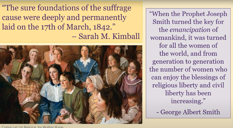 Sarah Kimball, who helped initiate the Relief Society in Nauvoo and then served for decades in Relief Society leadership in Utah, asserted that the sure foundations of the suffrage cause were deeply and permanently laid on the 17th of March 1842. That’s the Relief Society birthday. President George Albert Smith also, specifically, testified of this connection in 1945 saying, when the prophet Joseph Smith turned the key for the emancipation of womankind, it was turned for all the women of the world. From generation to generation, the number of women who can enjoy the blessings of religious liberty and civil liberty has been increasing.
