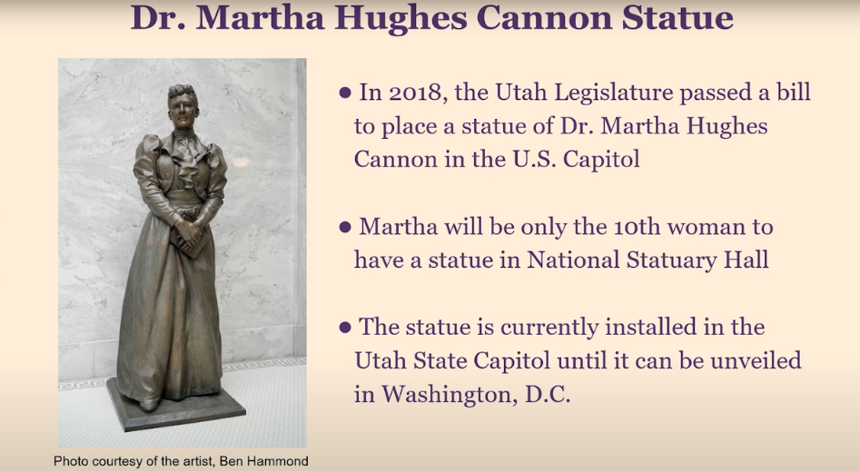 In 2018, the Utah Legislature passed a bill to place a statue of Dr. Martha Hughes Cannon in National Statuary Hall in the rotunda of the U.S Capitol. Each state gets two statues to represent it, and once her statue is installed, Martha will be only the tenth woman in the collection. Because the unveiling ceremony was delayed by the pandemic, the Martha statue is currently installed in the Utah State Capitol. So, you can go and see this really stunning sculpture, and it will be there until it can be unveiled in Washington, D.C. whenever the capital opens up again for that.