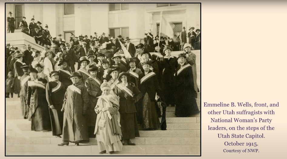 I love this image on the steps of the Utah State Capitol in 1915. Because Utah’s suffrage story began so early, it’s one of the few extant photographs that we have showing Utah suffragists with those iconic suffrage sashes and banners. On this day, Utah suffrage greeted a national suffrage envoy from the Congressional Union, the precursor to the National Women’s Party.