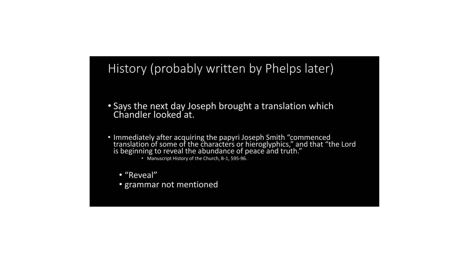 A little bit later, that same history writes this, “Immediately after acquiring the papyri,” so he brings a translation beside the papyrus, then” we commence translation of some of the characters or hieroglyphics,” and “the Lord is beginning to reveal the abundance of peace and truth.” So, again, the first thing is translation, and both of the official entries that we get there, the first thing is a translation. That’s what we get. Alright, words like reveal are used, nothing about a grammar is mentioned.