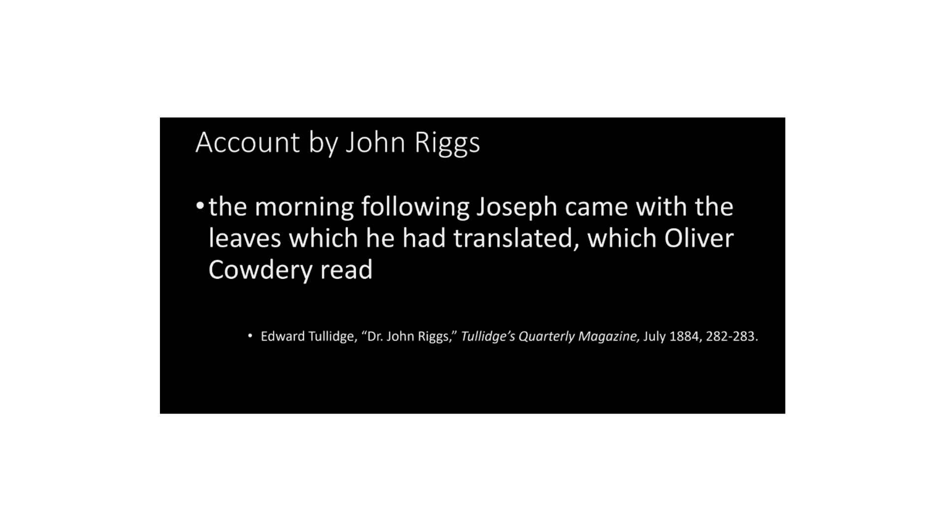 Alright, so we get all of that from John Riggs. And then this is what John Riggs says, “the morning following,” so Joseph has brought them home, looked at them over that night, “the morning following, Joseph came with the leaves which he had translated, which Oliver Cowdery read.” So that means in one day Joseph Smith had produced several pages of translation.
