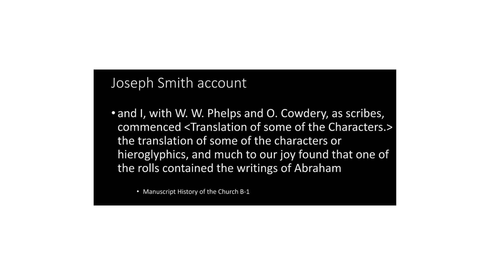 Now, let’s look at something we can test much more firmly, and that’s the historical sources. What do the historical sources tell us about the translation and how it happened? So, we’re going to look at the official history of the Church. Not what will become, but it was an official history of the Church. The entries we’re going to look at were probably written by W.W. Phelps and probably written later. But still, Phelps was an eyewitness. He was there when all this was happening and was very much a part of the process.