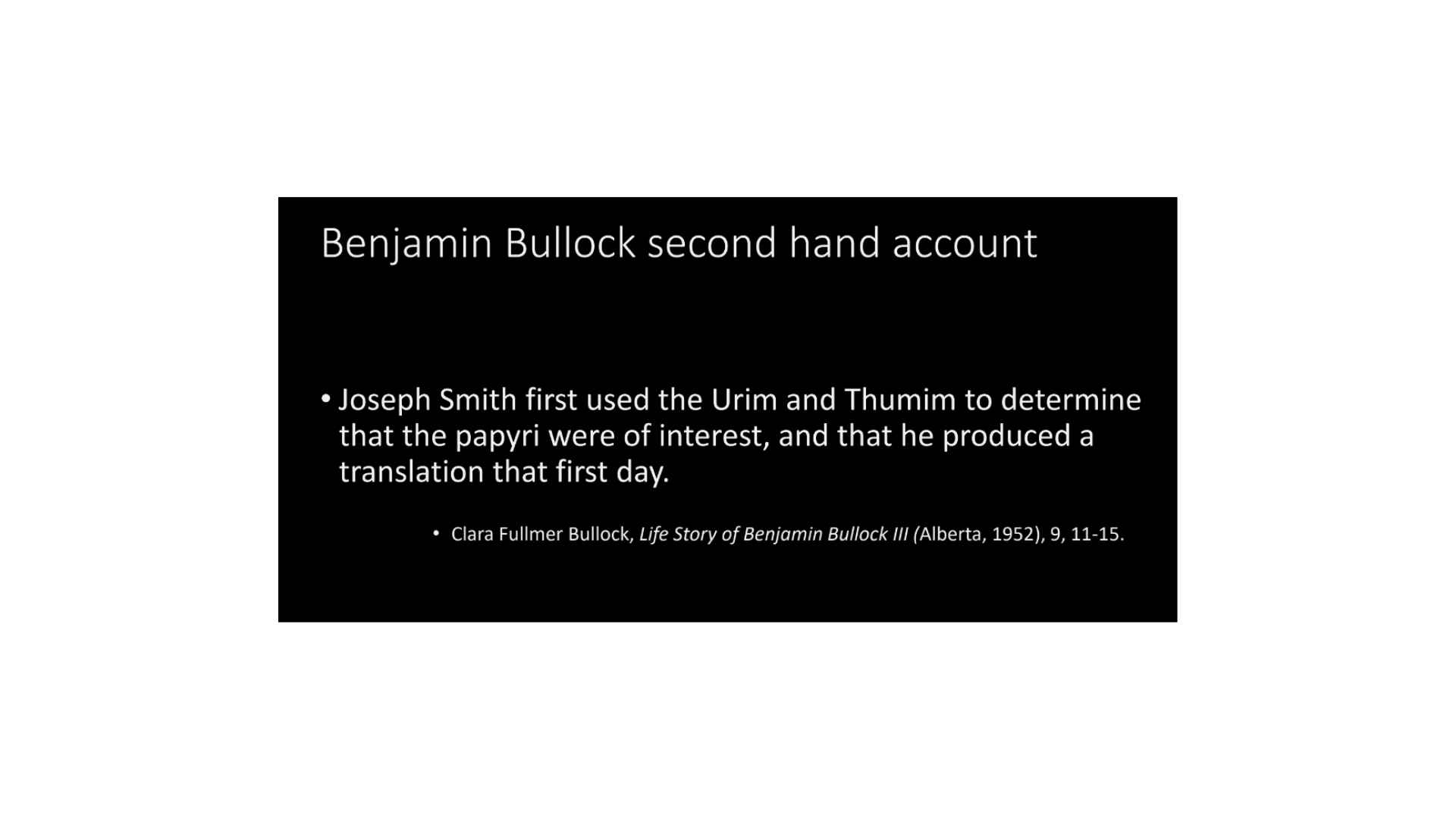This is a second-hand account. Benjamin Bullock is the man who was related to the Kimballs and came with Michael Chandler to Kirtland. Not a member of the Church, and we have his account as given from his granddaughter. So it’s a secondhand account, but this is what he passes on to his descendants as they remember it. “Joseph Smith first used the Urim and Thumim to determine that the papyri were of interest and that he produced a translation that first day.” Now it’s second hand, years later and yet it matches so well with what others.