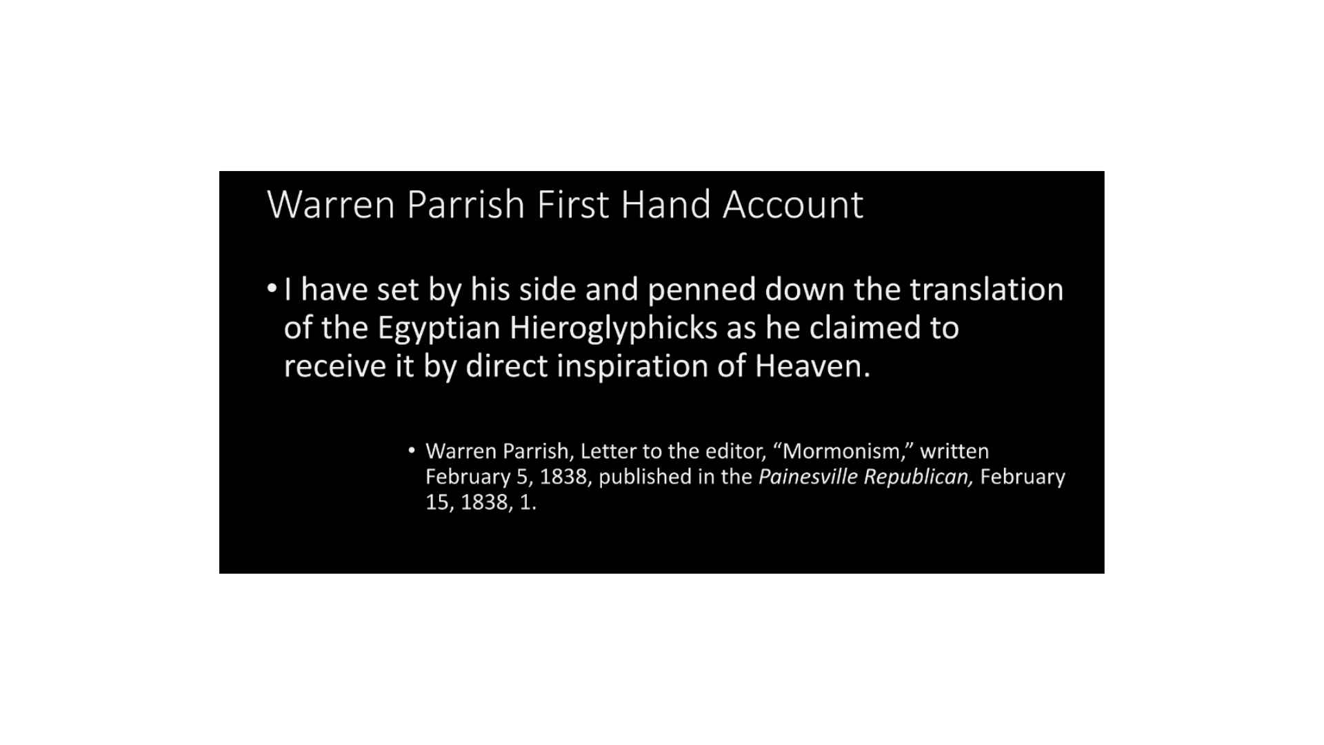 Warren Parrish, who at the point time he gives this statement is an enemy of Joseph Smith, no longer a believer, this is how he described, and he’s a scribe. He is very much a first-hand witness. He says, “I have sat by his side and penned down the translation of the Egyptian Hieroglyphics as he claimed to receive it by direct inspiration of Heaven.” Again, nothing about grammar and alphabet. Parish has some handwriting in the grammar and alphabet, he’s very familiar with it, he knows what it is, and when he describes the translation process he says nothing about that, he uses direct inspiration.