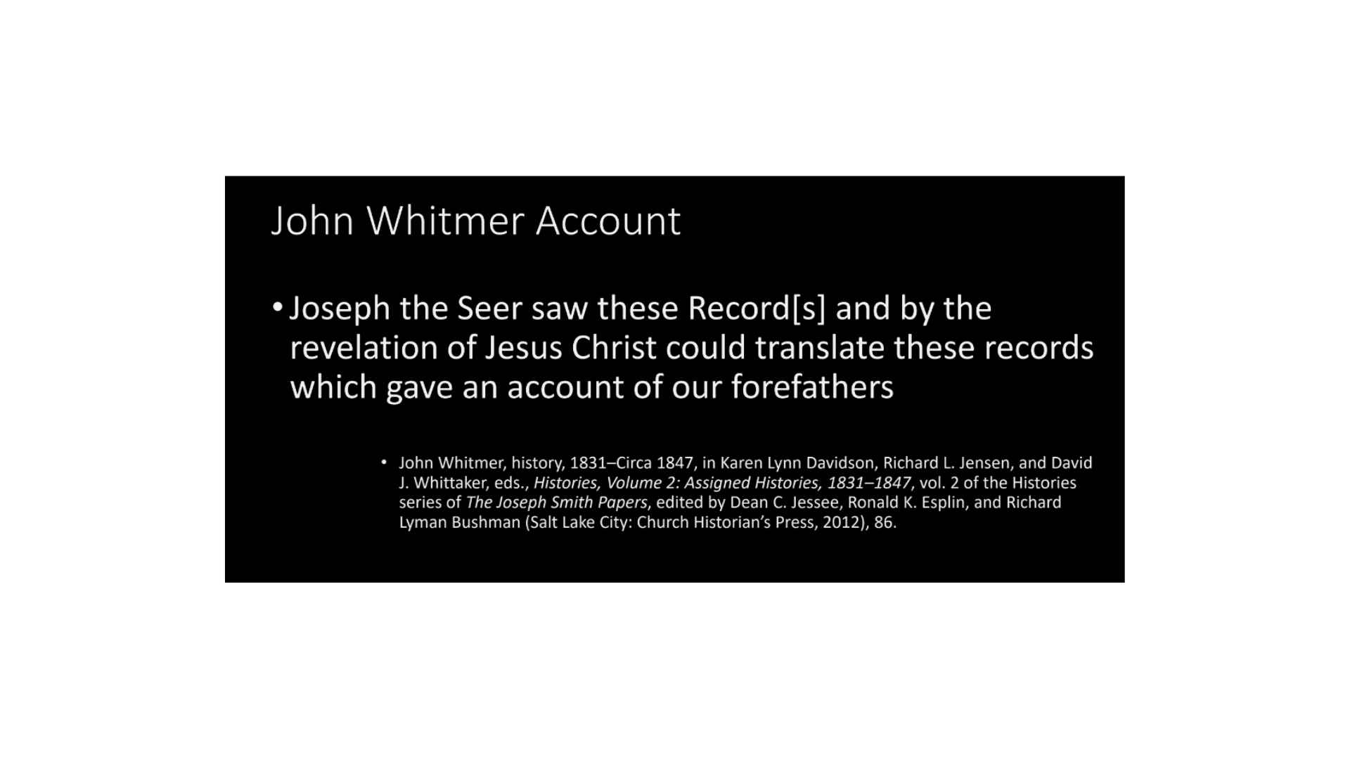 And again, if we’re going to talk about untested assumptions, the recent Joseph Smith Papers Project, Revelations volume 4, which is a very, very valuable tool, and in a moment I’ll show you just how valuable it can be. But it also has some assumptions in it.