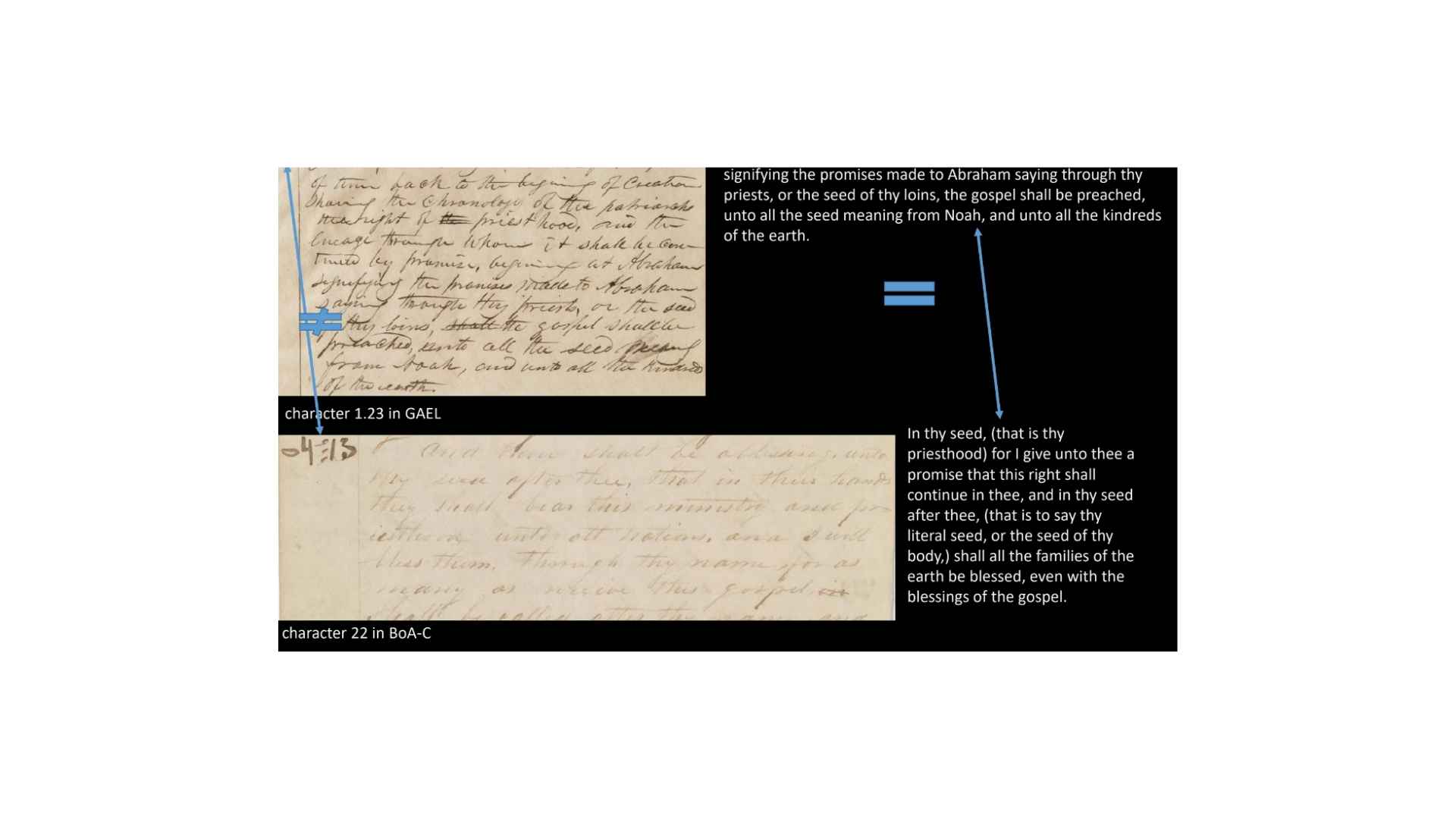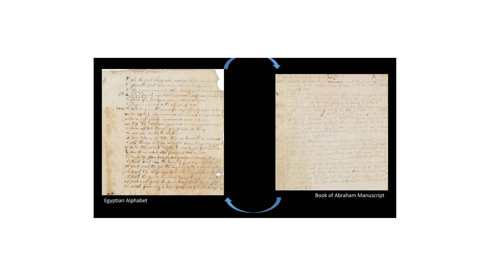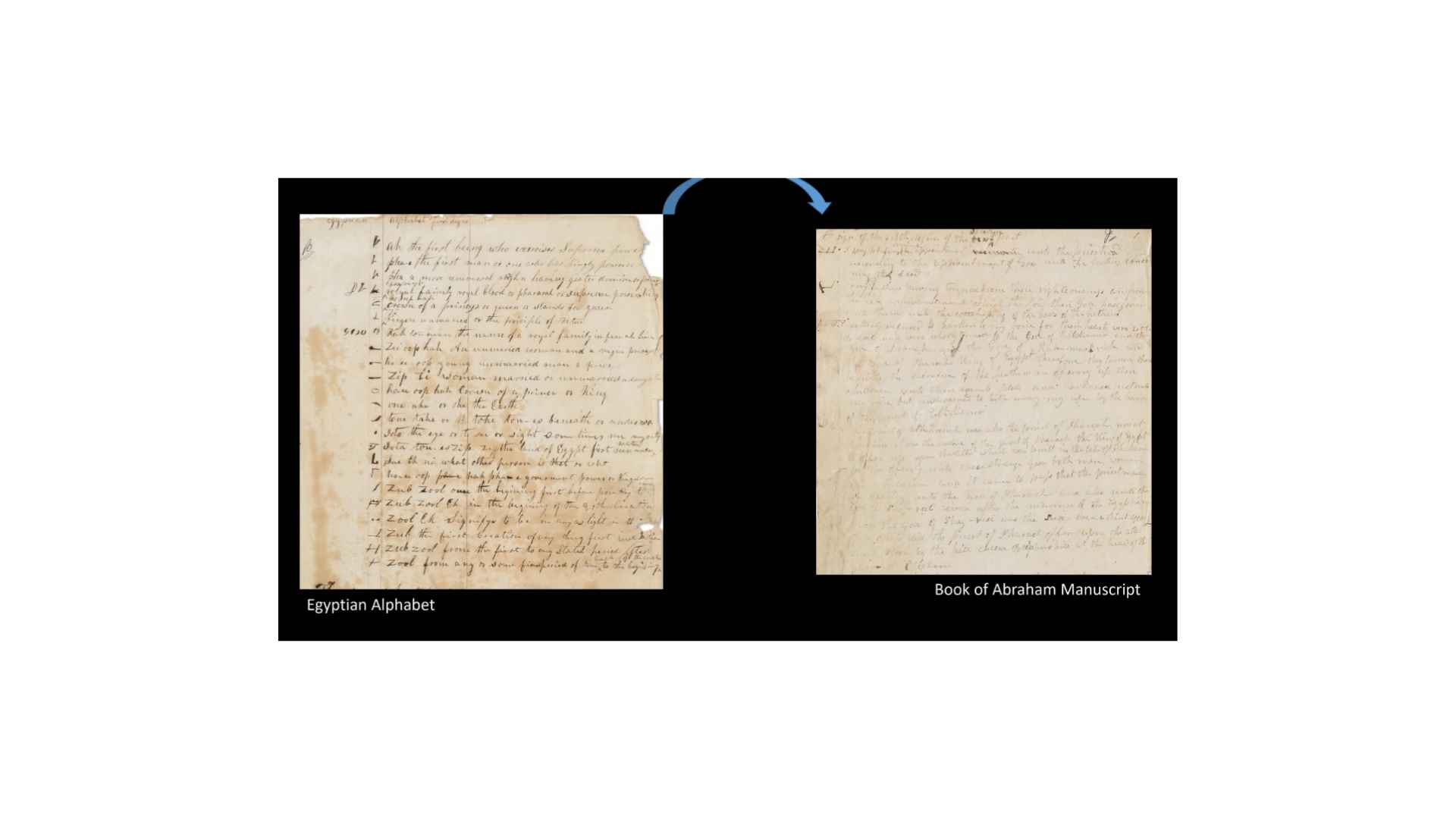 So, those on the right, the Book of Abraham manuscript, you can see those Egyptian characters on the left, that the grammar and alphabet was used to translate those characters into the text that we see on the right of the Book of Abraham manuscripts. So, it’s that specific subset of the hypothesis that we can test as we go through and look at the documents, all right?