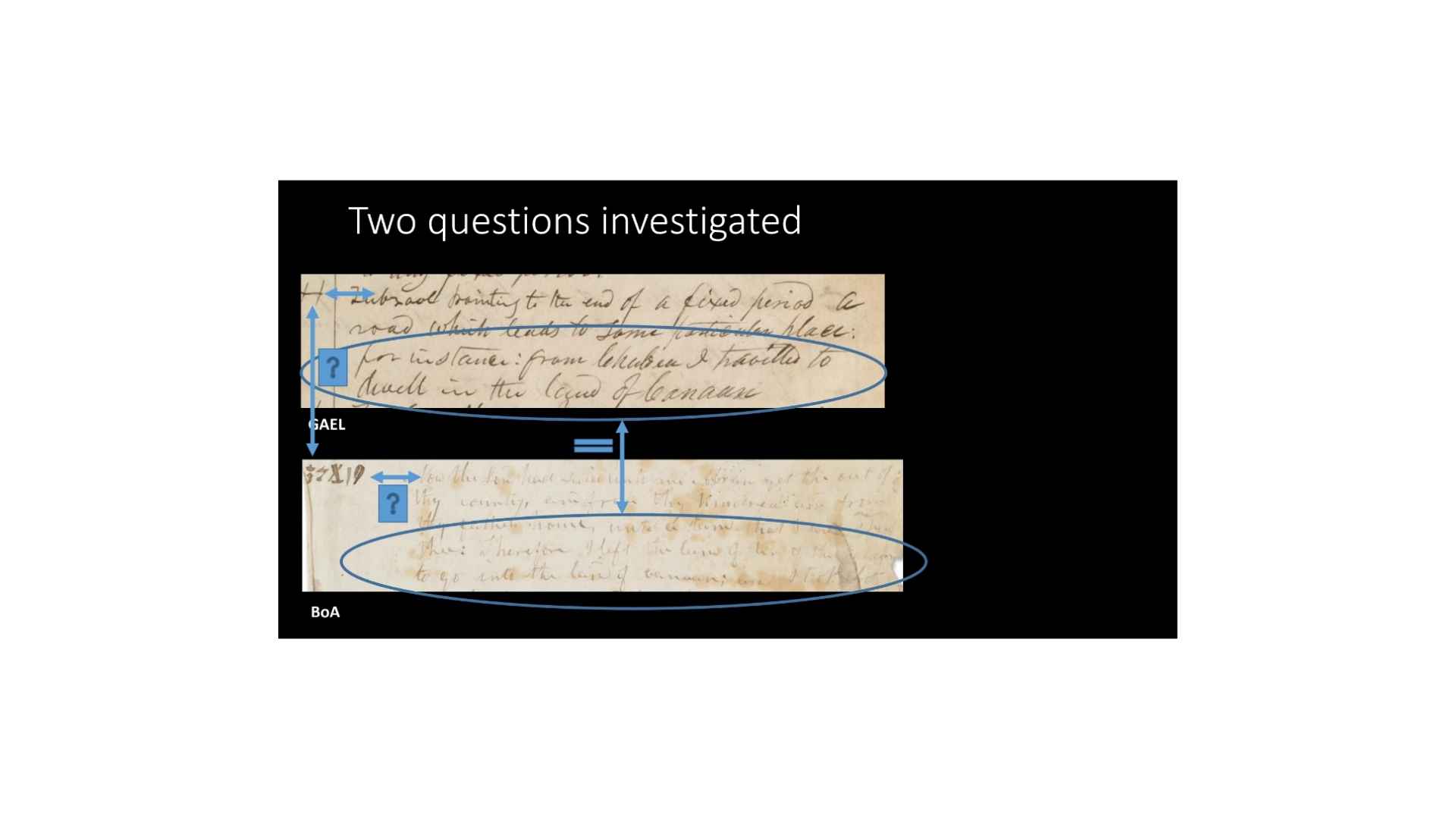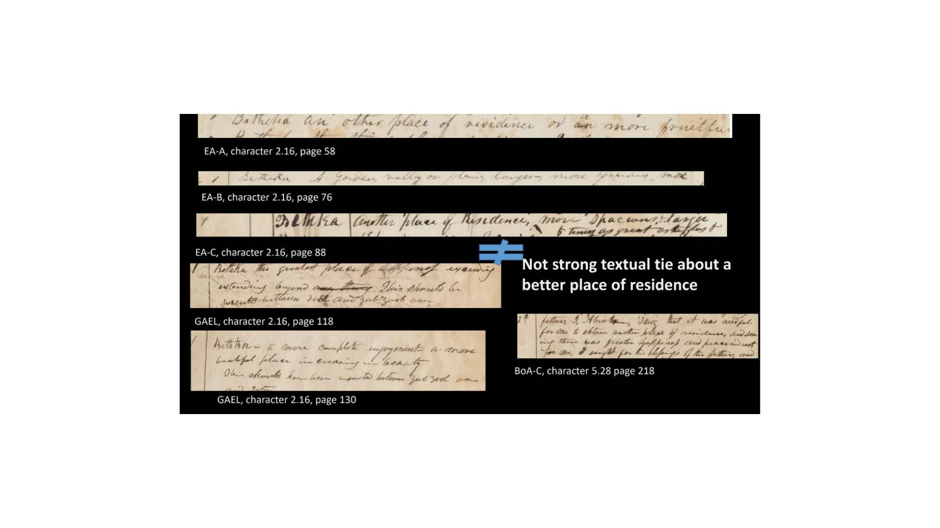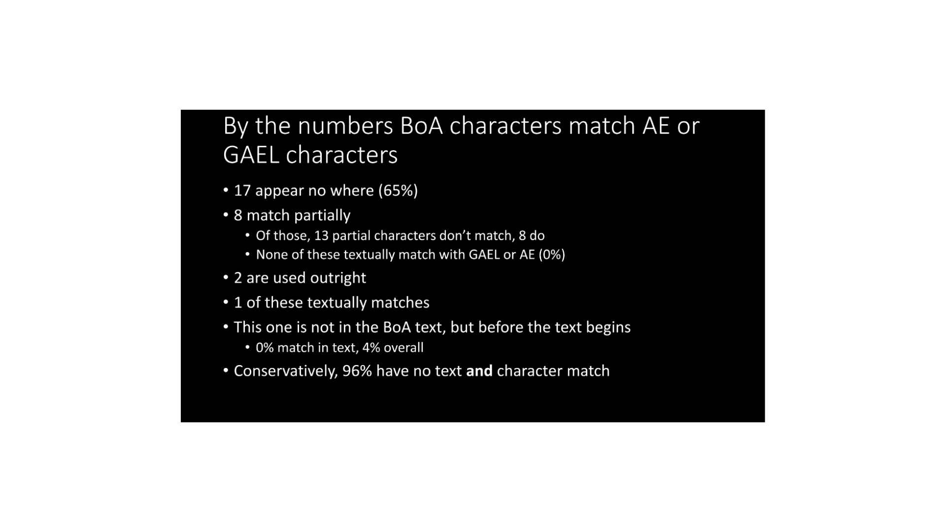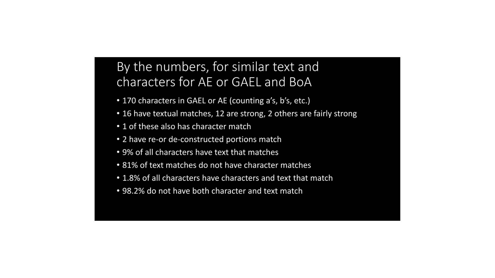 By the numbers, if we’re going to look at this, 170 characters, if we count all the different things that are in the GAEL or AE, 16 have textual matches, 12 are strong, two others are fairly strong. One of these also has a character match, and two, when we re-or de-construct them, have portions that match. So what we end up with is 81% of the text does not have a character match, but only 1.8% of all characters have characters and text that match. Which means that 98% of the time they don’t match, right? Ninety-eight percent of the time there’s no match whatsoever.