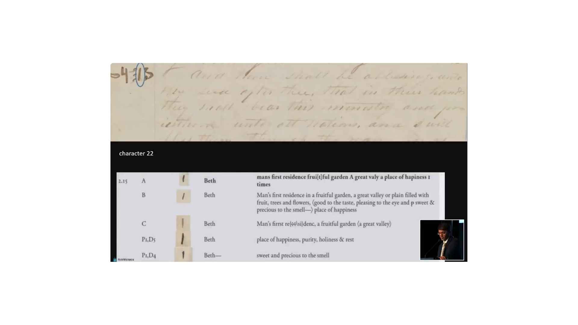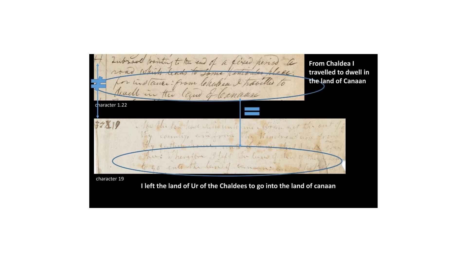 So, we’ll now talk about character 1.22 which you can see in the margin there, and you can see that the text talks about going from Chaldea and traveling into the land of Canaan, all right? So, “from Chaldea I traveled to dwell in the land of Canaan.” If we look in the Book of Abraham manuscript, we get “I left the land of Ur of the Chaldeas to go into the land of Canaan.”