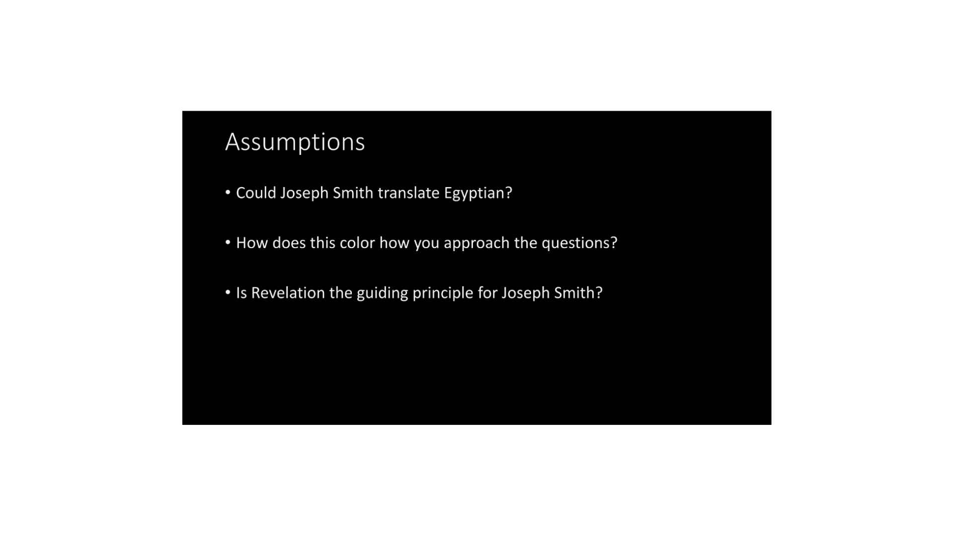 Let’s just use one example of this assumption. Another assumption I should say, you can ask yourself is revelation a guiding principle for Joseph Smith or is it not? That’s, even for a believing scholar, you will have to operate under that assumption. What was the guiding principle for Joseph Smith? Let me give you an example. This won’t be the focus of today’s talk, but I think it’s a good example of the kind of the way that our assumptions color our scholarship.