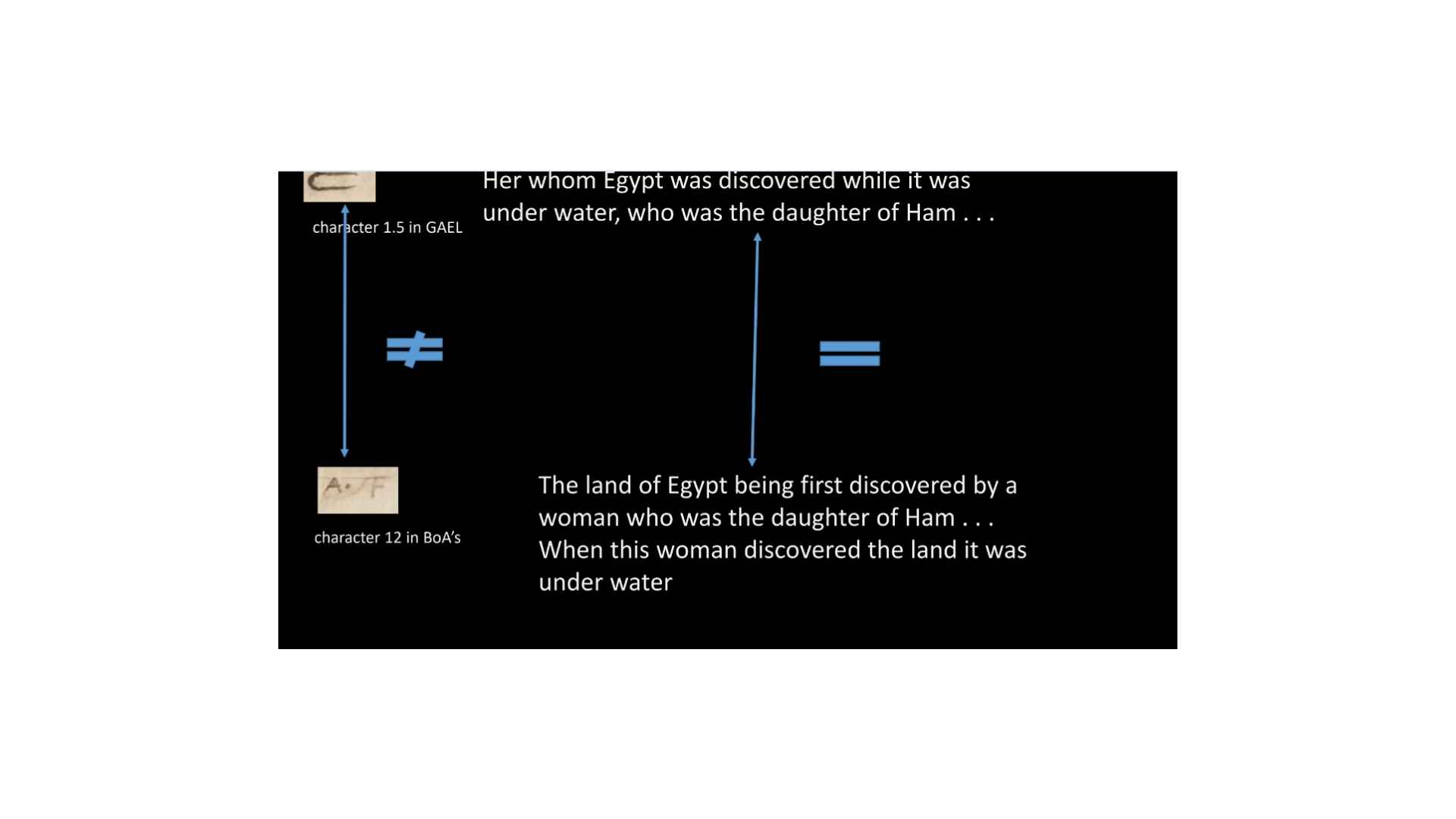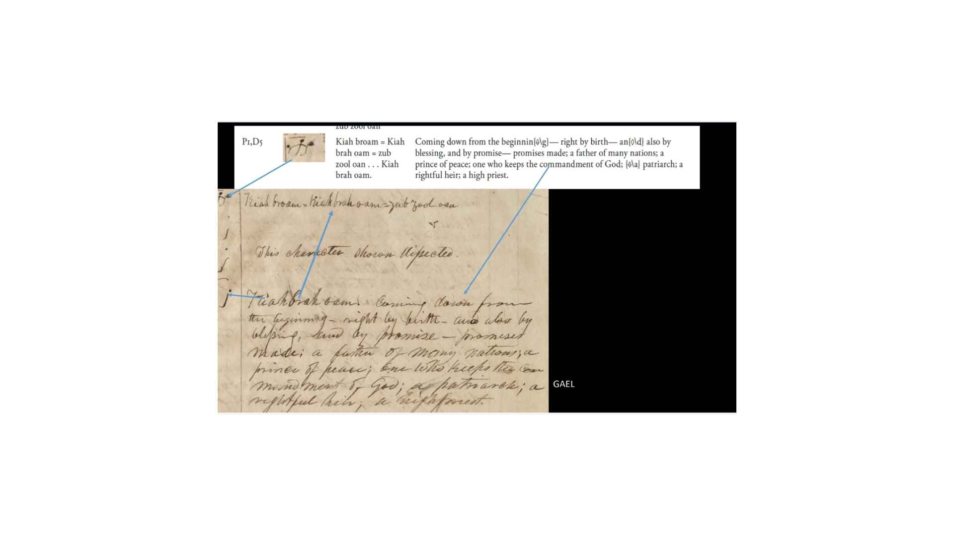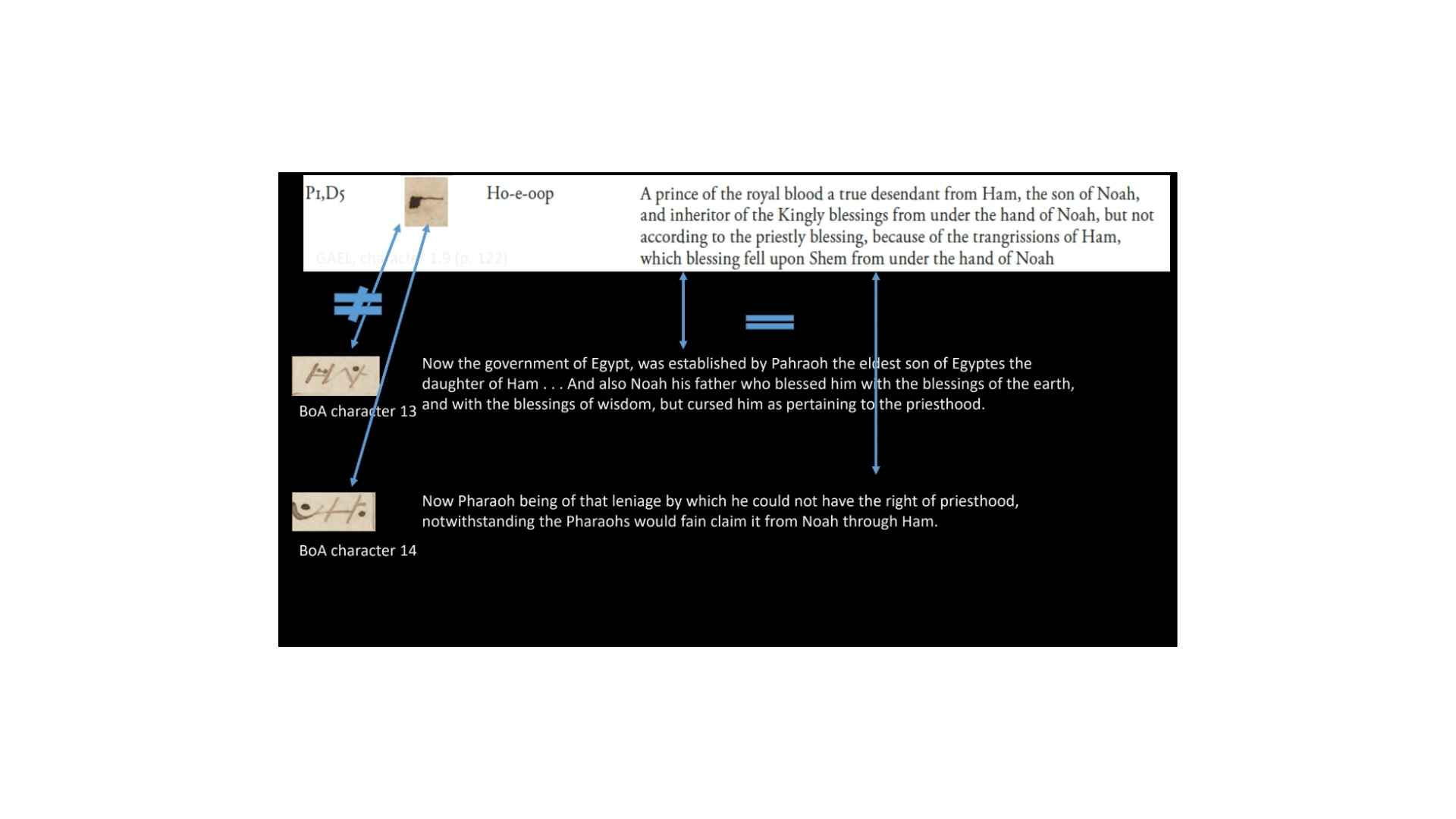 Character 1.5 in the GAEL has a definition of “Her whom Egypt was discovered while it was under water, who was the daughter of Ham. . . Character 12 in the Book of Abraham manuscript says “The land of Egypt being first discovered by a woman who was the daughter of Ham. . . When this woman discovered the land it was under water.” Alright, so you can see again, not a perfect match but a good enough match that we can say that’s a good textual match. But again, the characters don’t match at all.