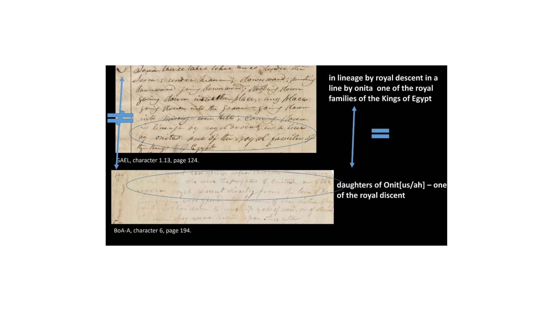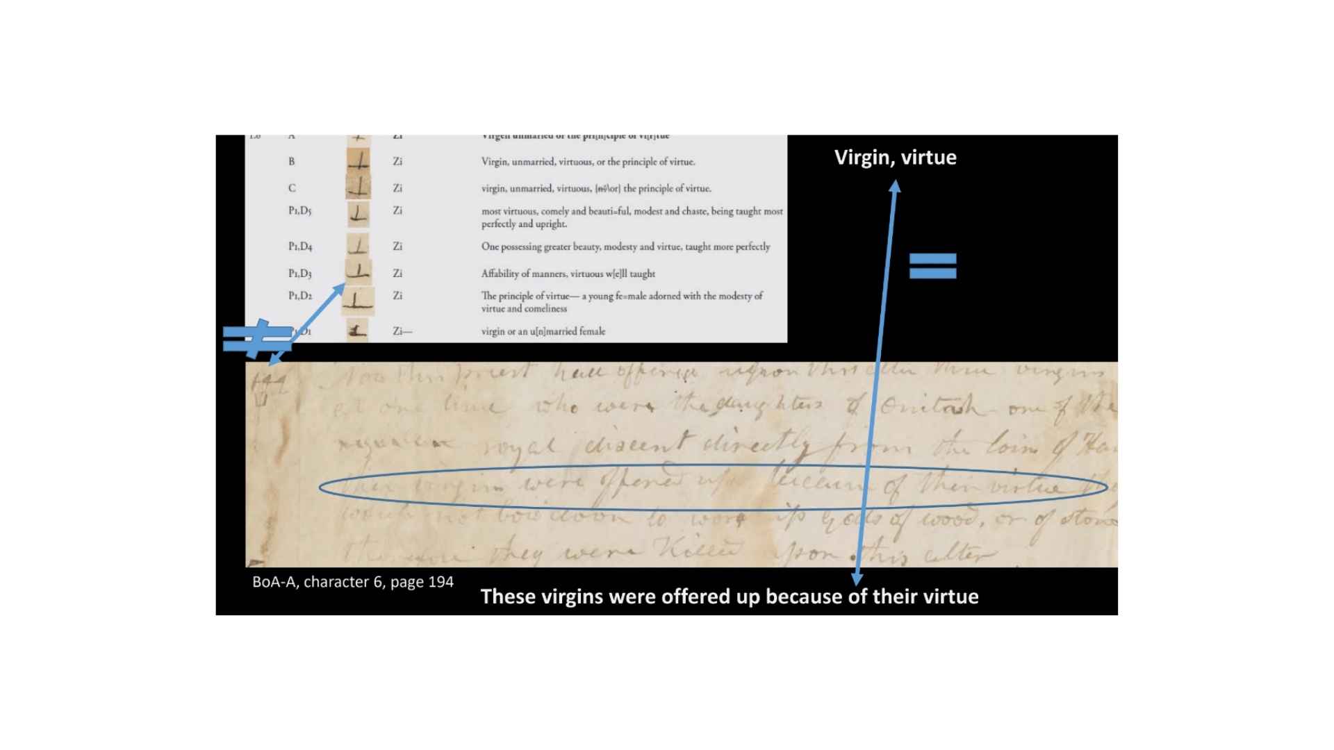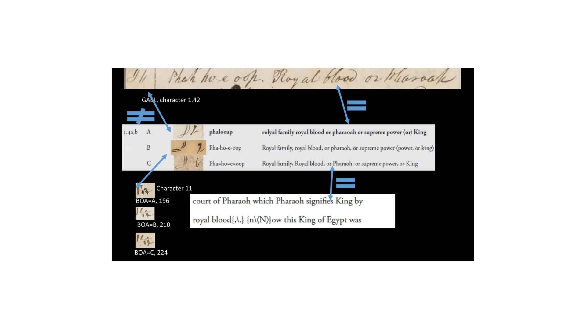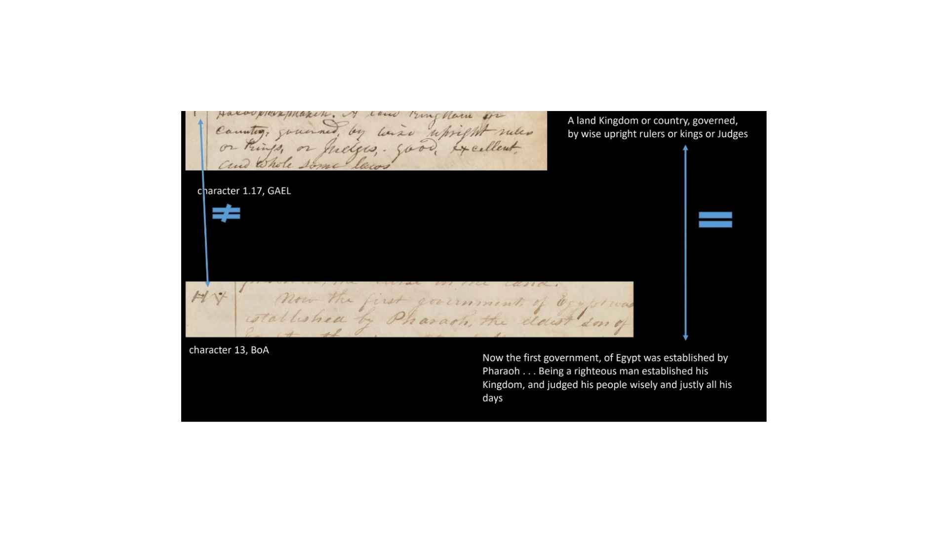 Character 1.5 in the GAEL has a definition of “Her whom Egypt was discovered while it was under water, who was the daughter of Ham. . . Character 12 in the Book of Abraham manuscript says “The land of Egypt being first discovered by a woman who was the daughter of Ham. . . When this woman discovered the land it was under water.” Alright, so you can see again, not a perfect match but a good enough match that we can say that’s a good textual match. But again, the characters don’t match at all.