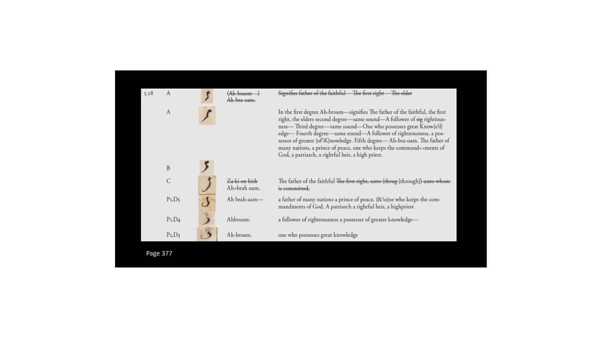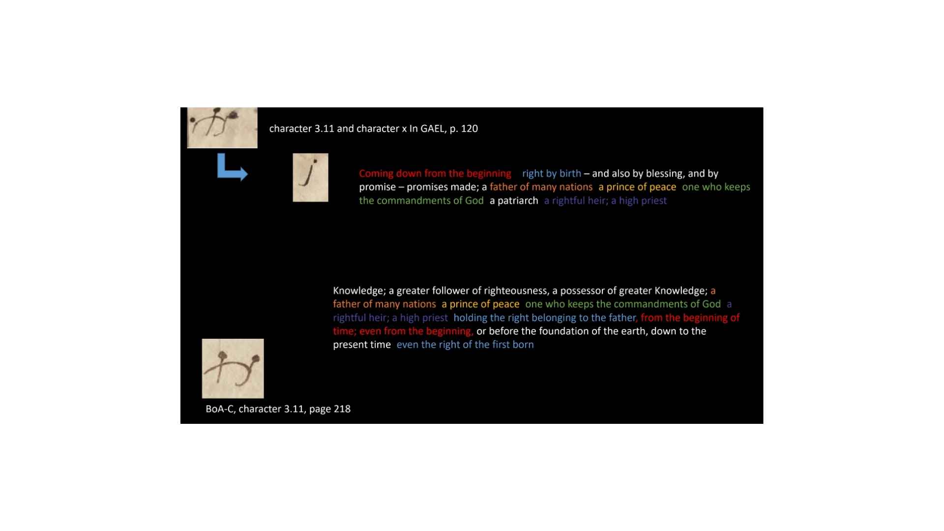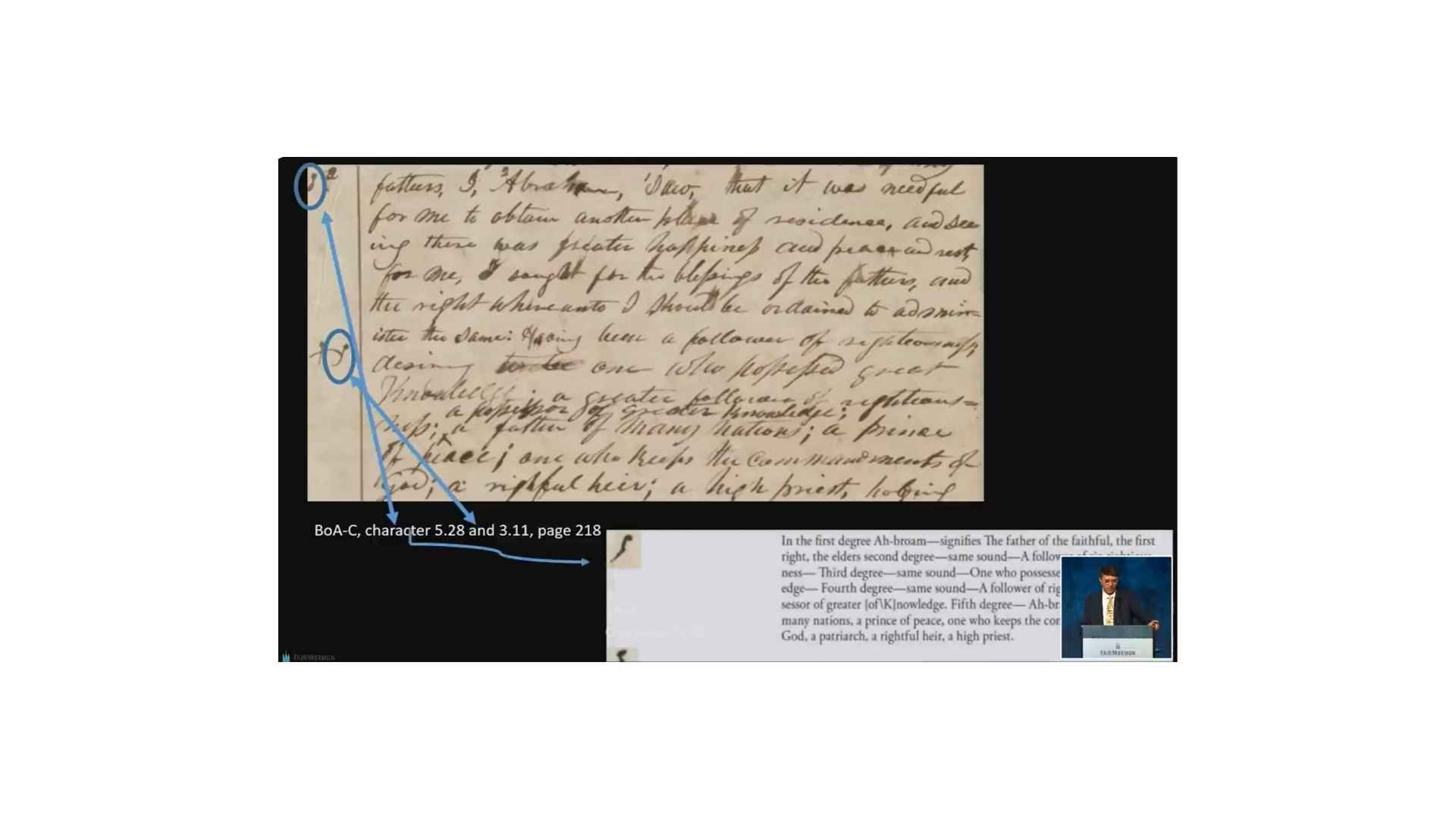 And so that suggests as as we get from this character on the papyrus, that suggests that when we get this little character created here, obviously it doesn’t match so we’re going from papyrus, the character on the left is the Book of Abraham manuscript, the character on the right is the alphabet and grammar. And so it would seem that we’ve gone from the papyrus to the Book of Abraham manuscript, and then to the alphabet and grammar. So that suggests that we’re translating first and then trying to create a grammar afterwards.