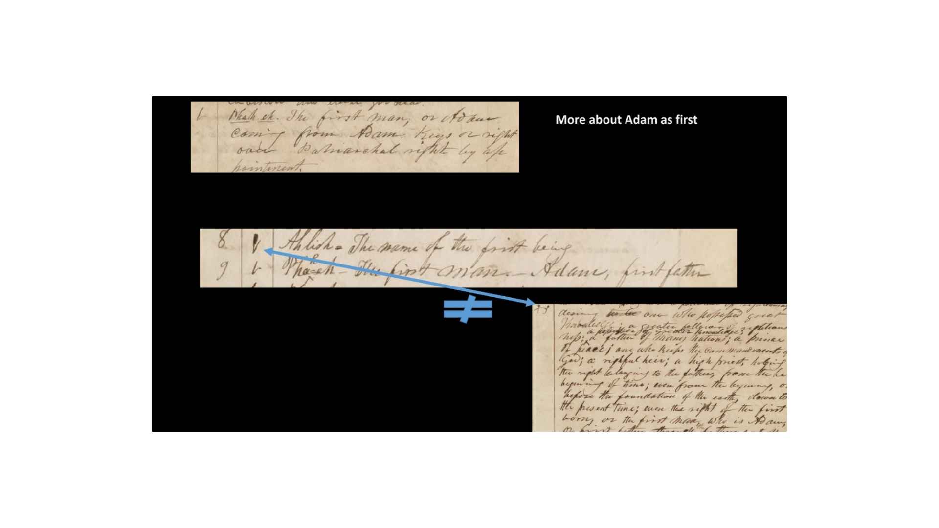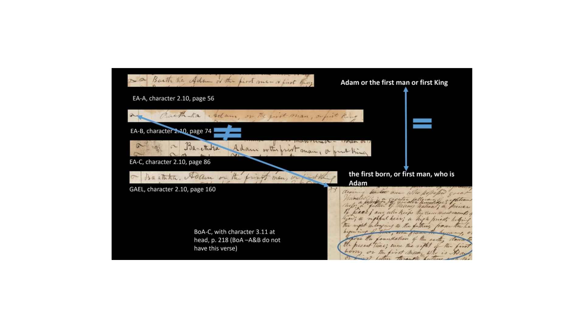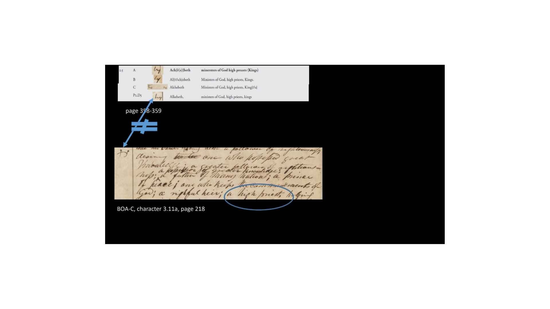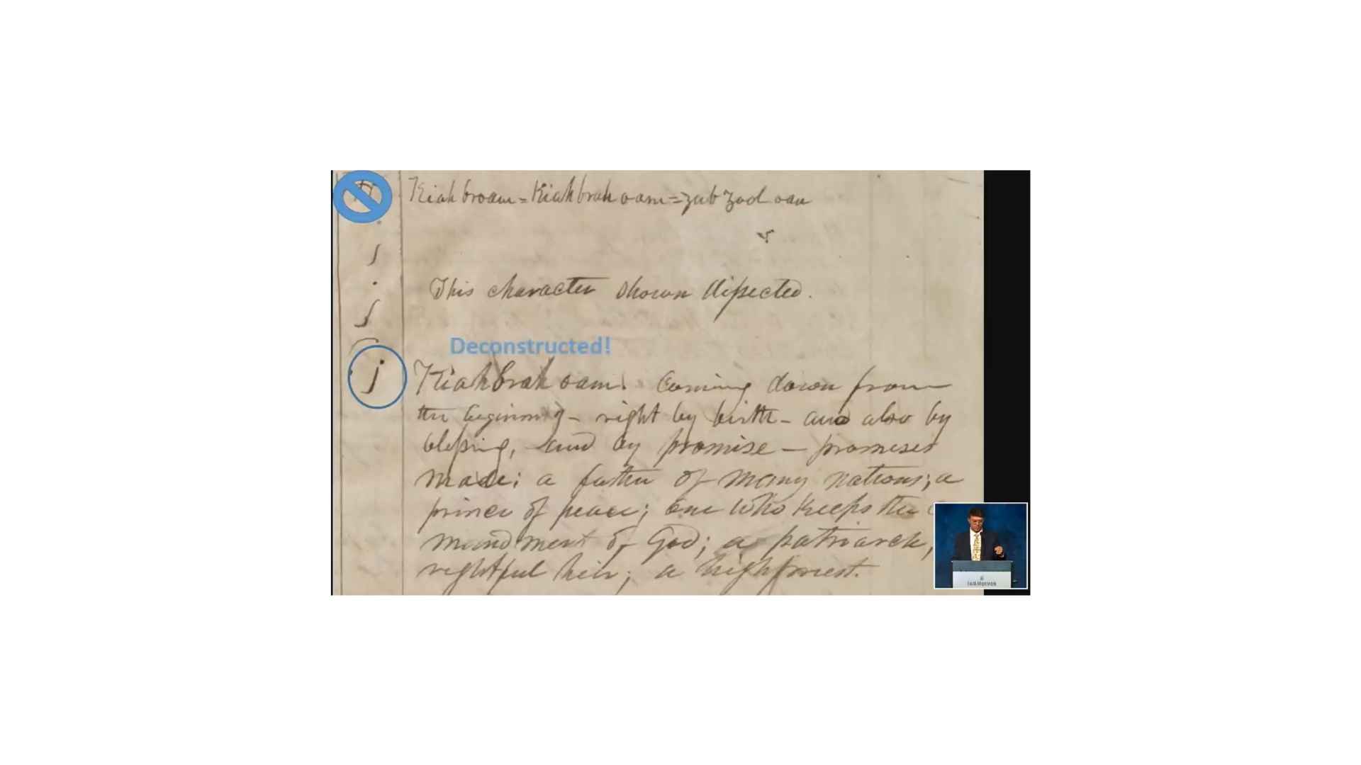 And so that suggests as as we get from this character on the papyrus, that suggests that when we get this little character created here, obviously it doesn’t match so we’re going from papyrus, the character on the left is the Book of Abraham manuscript, the character on the right is the alphabet and grammar. And so it would seem that we’ve gone from the papyrus to the Book of Abraham manuscript, and then to the alphabet and grammar. So that suggests that we’re translating first and then trying to create a grammar afterwards.