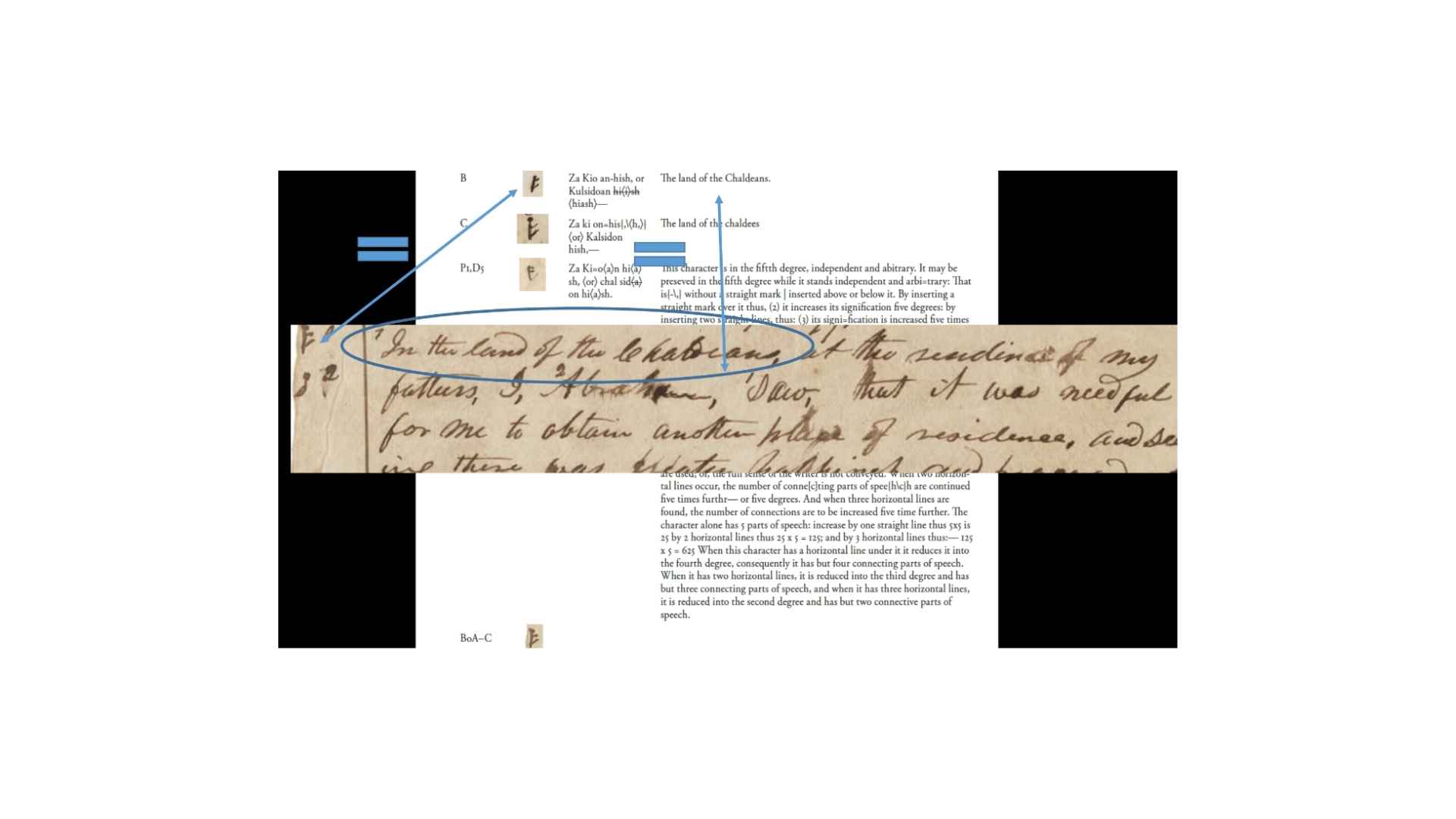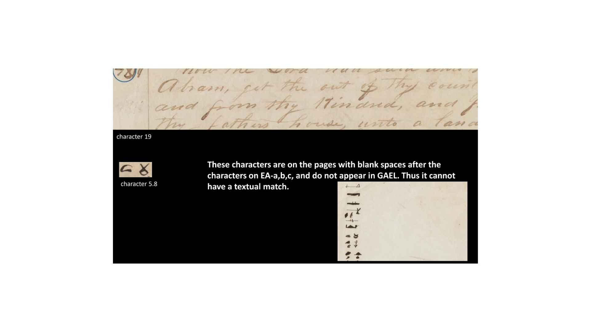 And it’s also used in the Egyptian alphabets, say “land of the Chaldees.” It’s not in one of the Egyptian alphabets. So that’s a good textual match with a character match there. But those actually, sorry, no, the characters don’t match, but the textual text does match. So the characters don’t match well, but the text does match, and that’s already something that’s a character we looked at earlier.