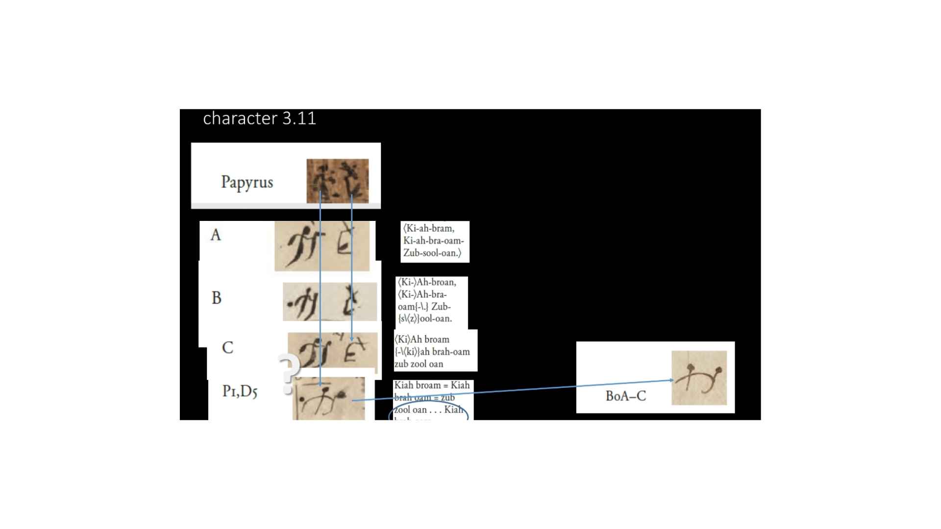 Here’s a really interesting one. So as we look at the characters on the papyrus—and that’s part of what we have to do as well, is look at the papyrus characters and see how they end up on the alphabet and grammar, and so on and so on.