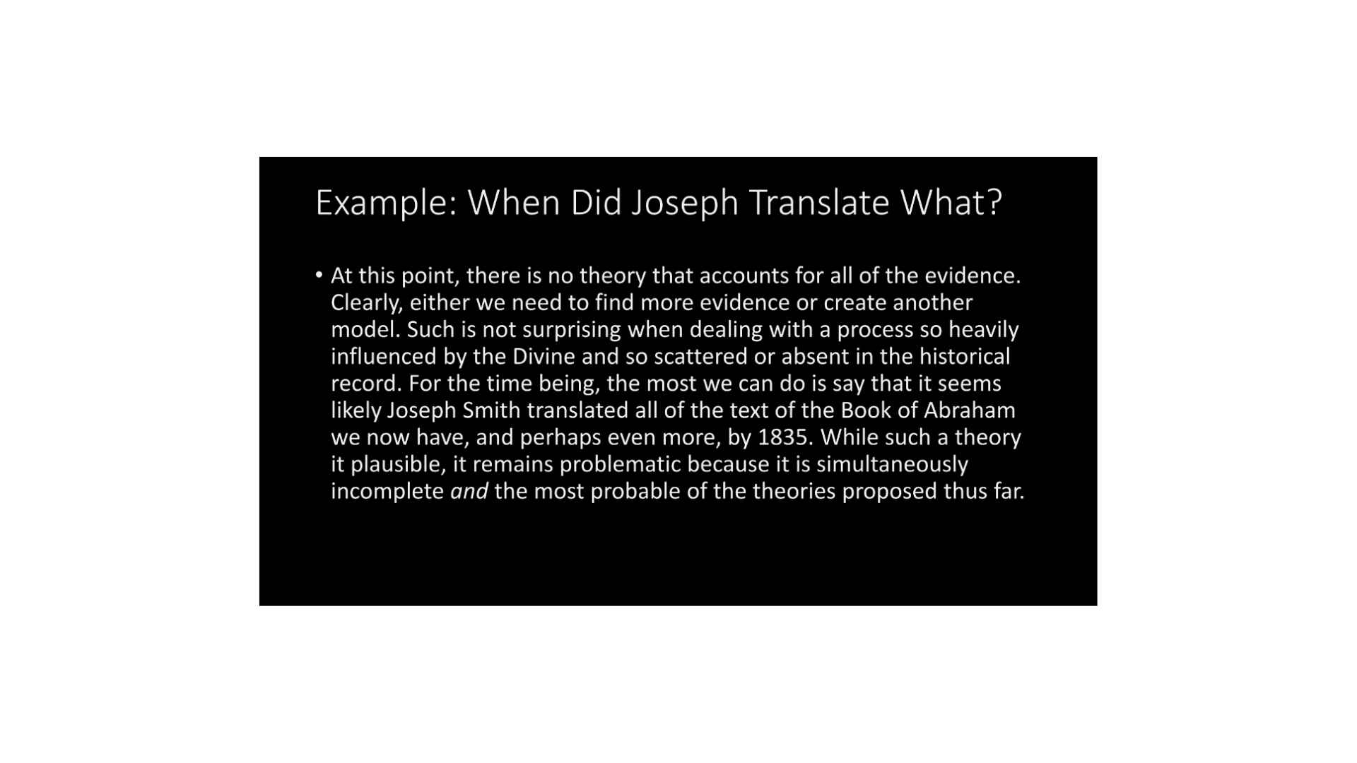 For the time being, the most we can do is say that it seems likely Joseph Smith translated all of the texts of the Book of Abraham we now have, and perhaps even more, by 1835. While such a theory is plausible, it remains problematic because it is simultaneously incomplete and the most probable of the theories proposed thus far.”