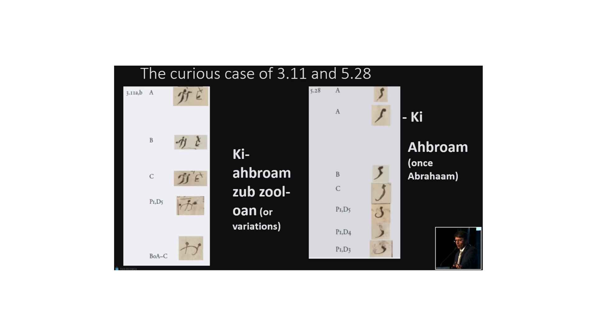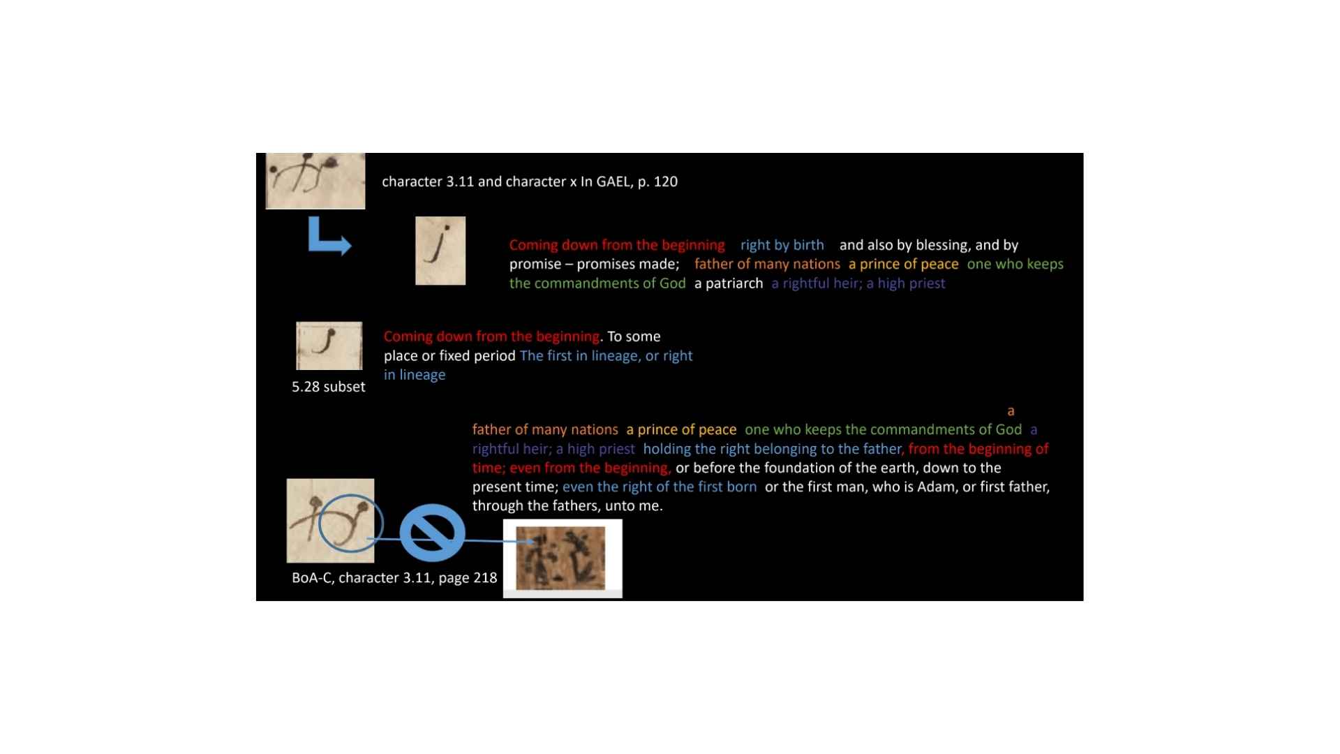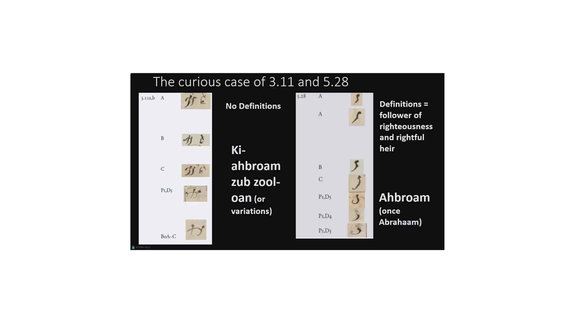 But the interesting thing is that we have another character that’s labeled. So the characters on the left are labeled character 3.11 and the character on the right is 5.28. And that one is Ahbroam, alright, Ahbroam (once it’s Abrahaam). So, and you can see that it is similar to the right-hand part of character 3.11, which is Ki-ahbroam zub zool-oan, or its variations. So 5.28 doesn’t have Ki and it doesn’t have zub zool-oan.