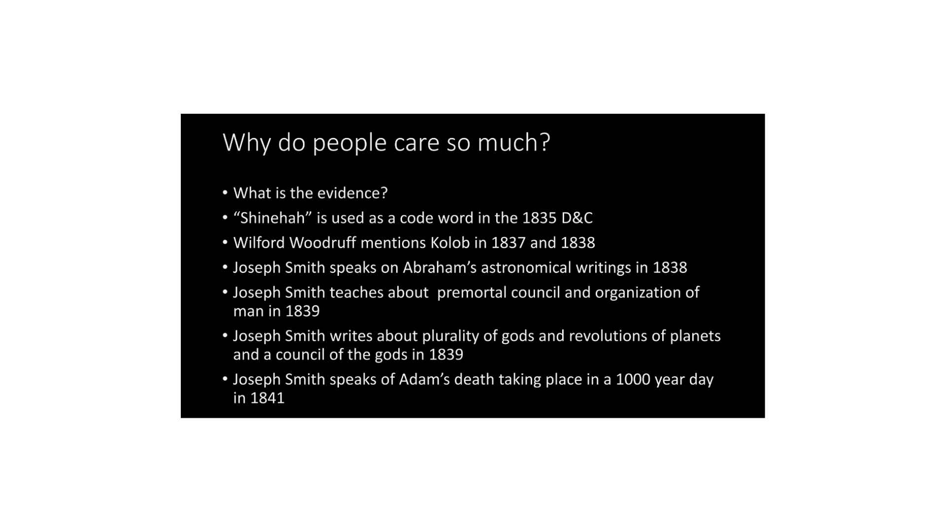 And I was perplexed after going through this evidence that some people did not see this as any kind of evidence that he had translated anything in the Book of Abraham that had to do with this before 1835, until I realized from a podcast I listened to that their assumption actually was that Joseph Smith had these ideas and they were kicking around in his head and then he created the Book of Abraham to codify and justify those ideas. And these are believing scholars.