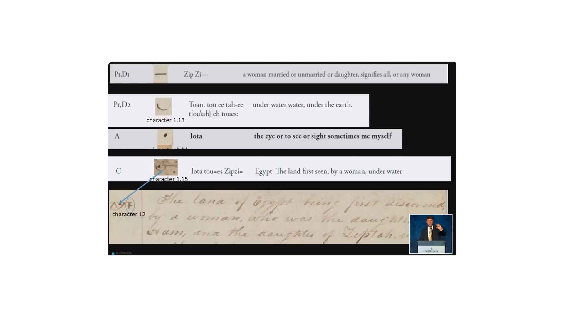 You get one character who says a woman is married or unmarried, signifies all or any woman and another that says underwater and another that says the eye, or to see or sight, or sometimes me, myself. And then when you see all the characters put together it says “Egypt.The land first seen, by a woman, under water.” And you can see that character here where it says “The land of Egypt being first discovered by a woman, who was the daughter of Ham and the daughter of Zeptah” and so on and so on.