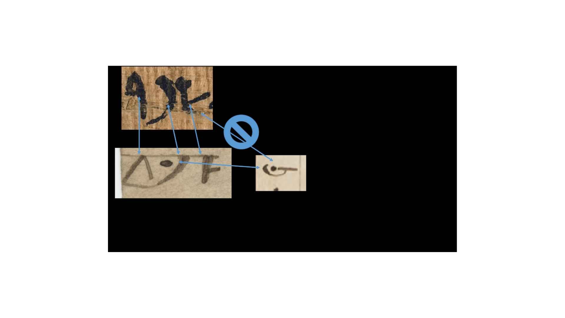 So this would suggest, in this case, that it came from the papyrus. Because if we go back, you’ll see that the Book of Abraham manuscript, you cannot recognize that as having to do with what’s on the papyrus at all, but you can see it kind of going through variations that could arrive at that symbol. And so if that were the case, then that would suggest that the Egyptian alphabet was used to at least create the character that is on the Book of Abraham manuscript. But it turns out this one is not so simple.