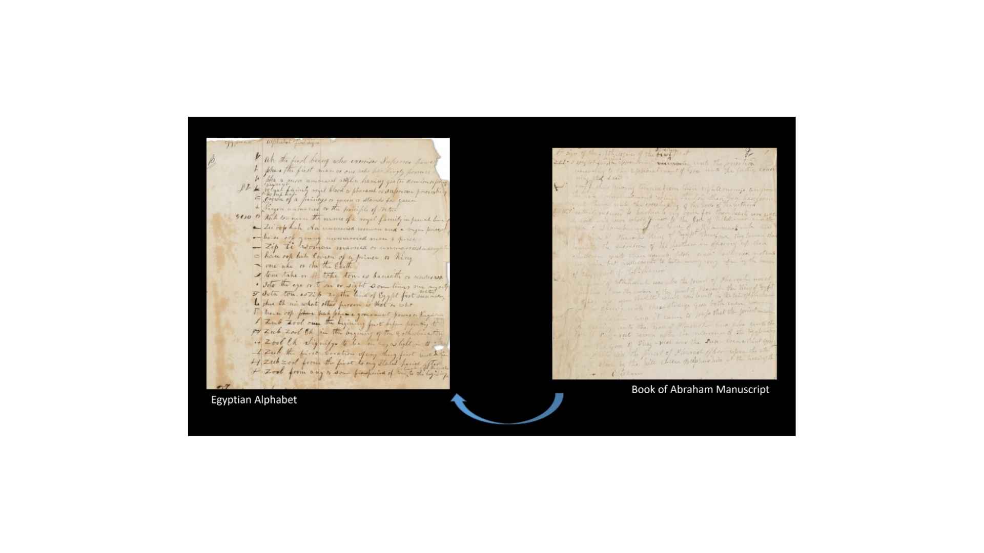 First of all, the limitation is that, while we could get into a thousand things about what we could call the Egyptian papers–which are the translation manuscripts that are now extant of the Book of Abraham, the earliest ones we now have, which don’t seem to be the earliest ones, the various copies of Egyptian characters, and the three documents known as the Egyptian alphabet, and a larger one called the grammar and alphabet of the Egyptian language–there are a thousand things we could do with those. We are only going to be addressing this one question today, which is, what is the relationship between the Egyptian alphabets and the grammar and alphabet, and the translation of the Book of Abraham? And in some parts, we’ll only address very specific parts of that.