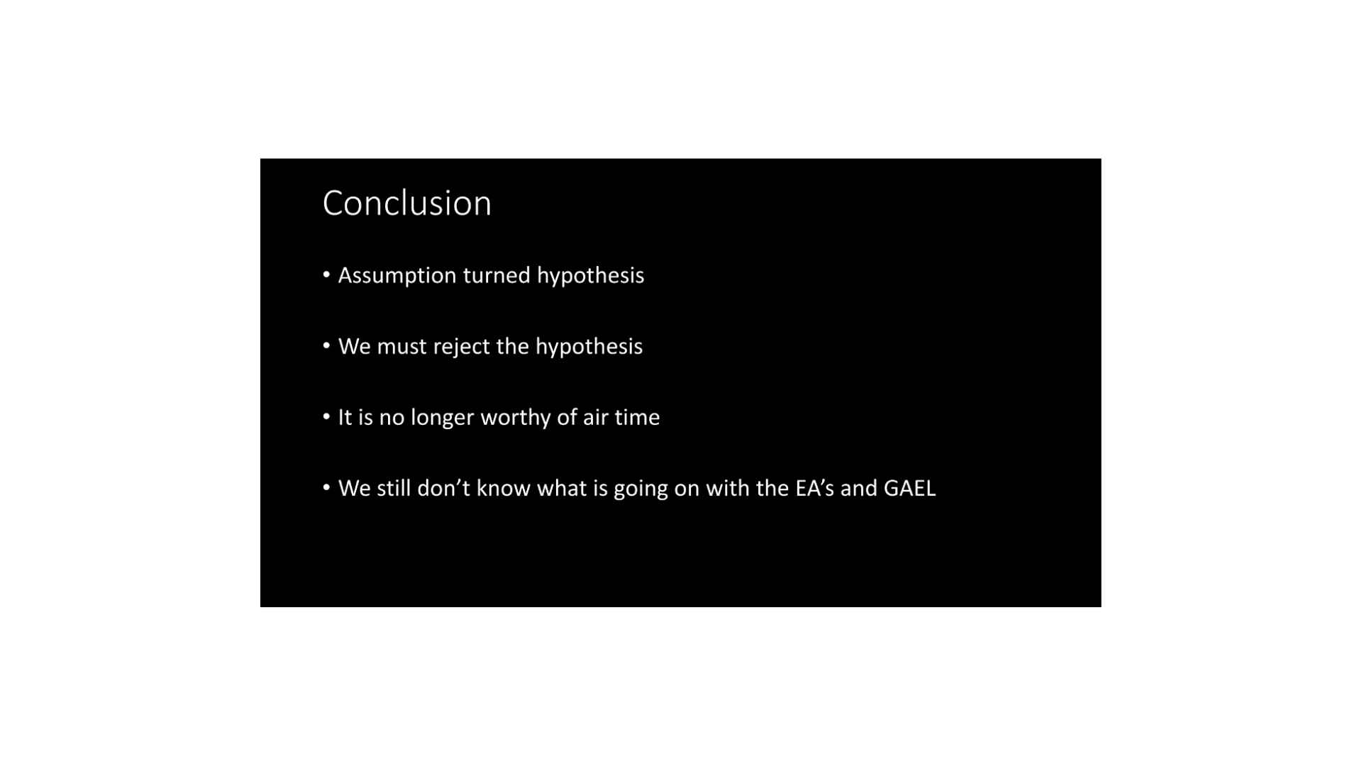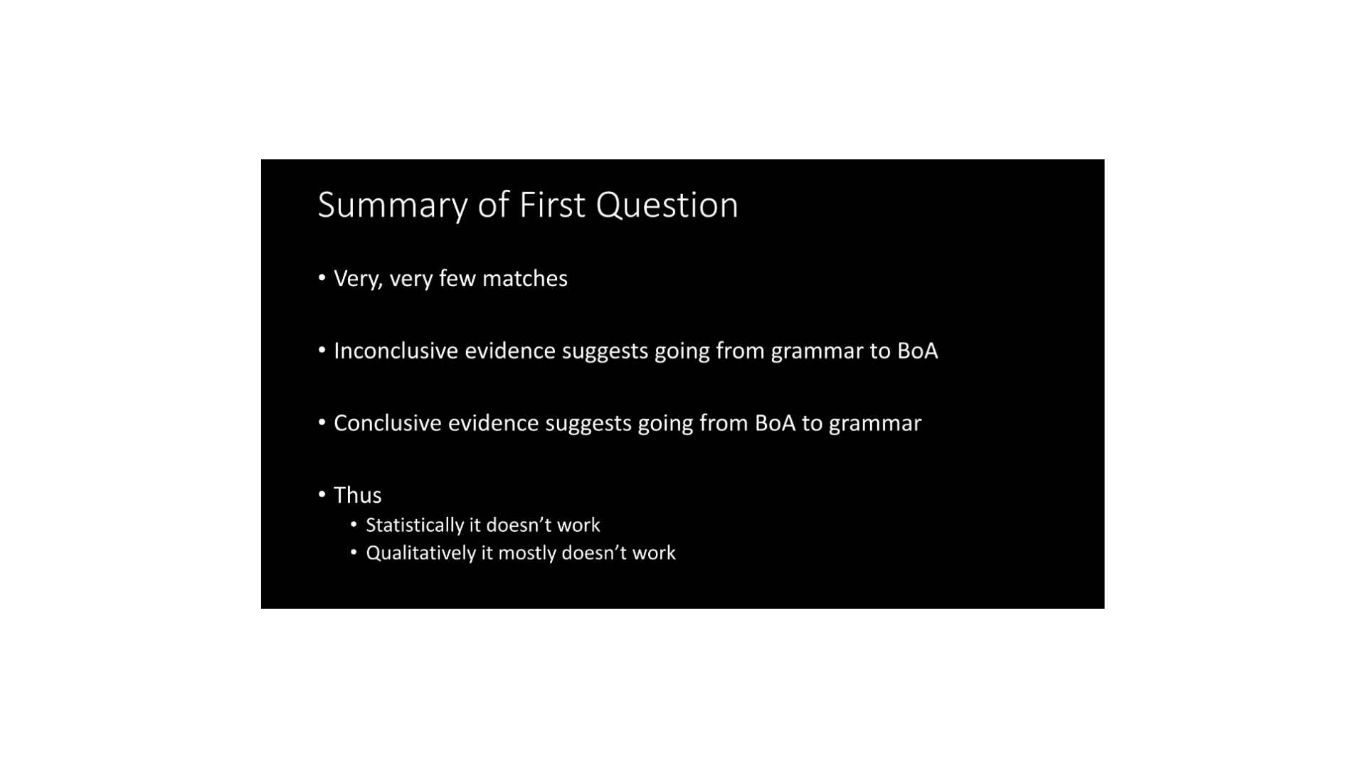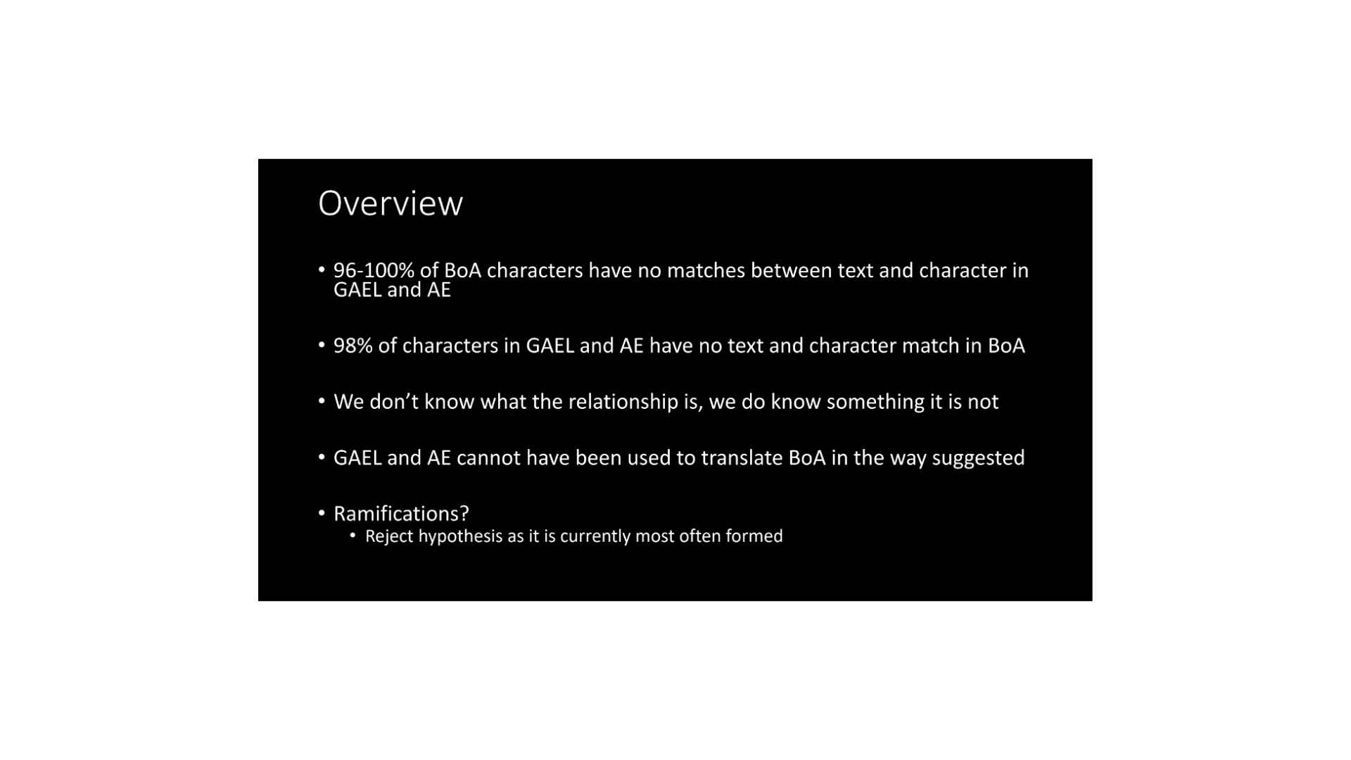 So I would conclude that once we’ve turned this assumption into a hypothesis, we have to reject it. That means really we’re best served by moving on. If we want to understand what’s going on with the alphabet and grammar, let’s not keep spending our time on a hypothesis that we now know does not work. Let’s spend our time looking into other possibilities and maybe then we can come to understand them better. Thank you very much.