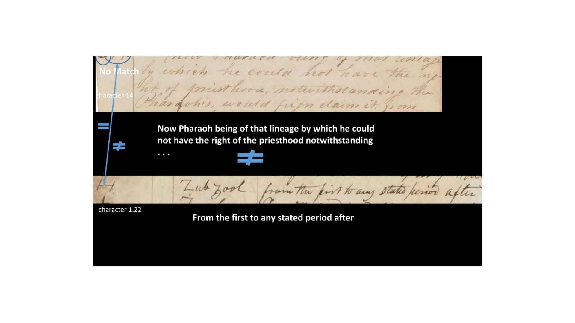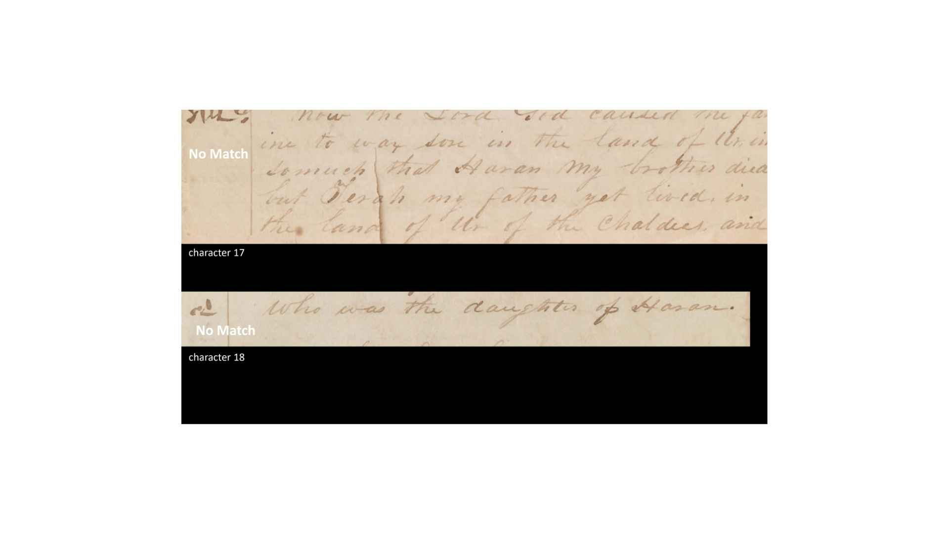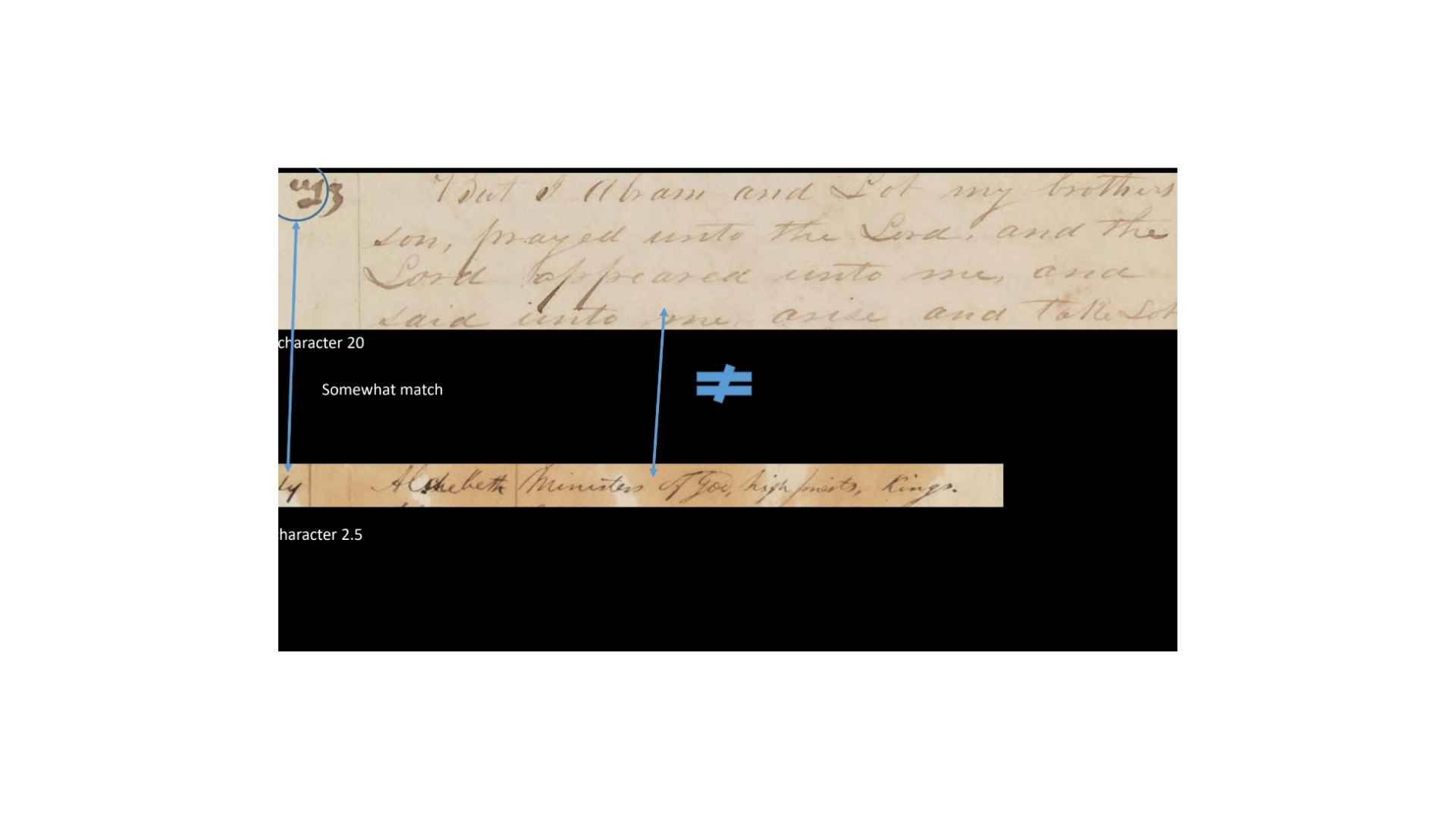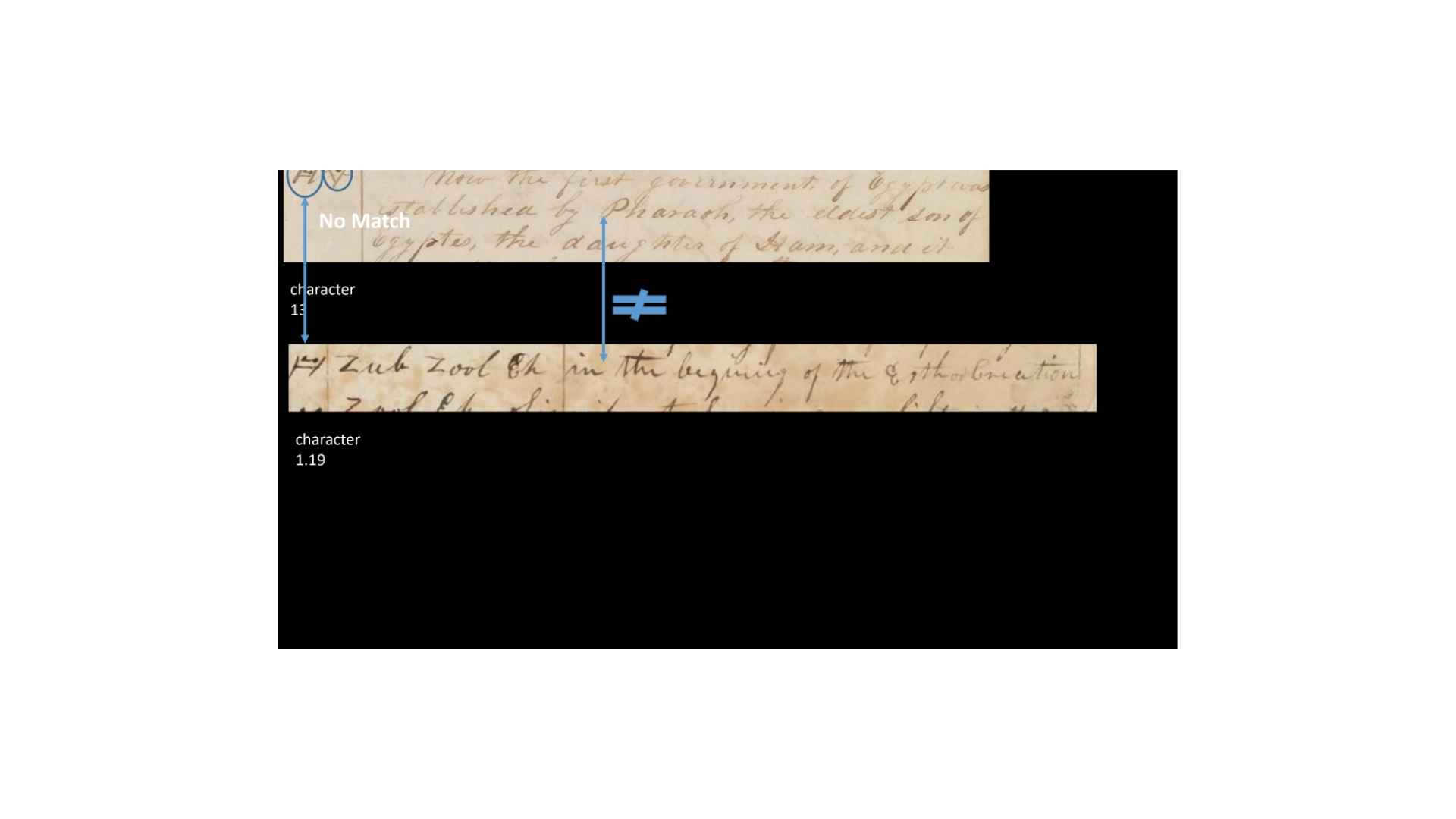 So, you can see, in this case, that the text, it’s not a perfect match, but it’s a rough match. It’s a translatable match. So, when they match, do the characters match? So, you can see what we’re doing. If the grammar and alphabet is being used to translate the characters and the margins, then we should find some match between those, right?