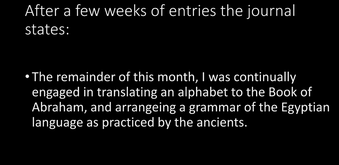 Okay, then after a few weeks of journal entries, and again, these are all being made afterwards, but still, they’re trying to reconstruct how things happened. Then they write, “The remainder of this month, I was continually engaged in translating an alphabet of the Book of Abraham and arranging a grammar of the Egyptian language as practiced by the ancients.”
